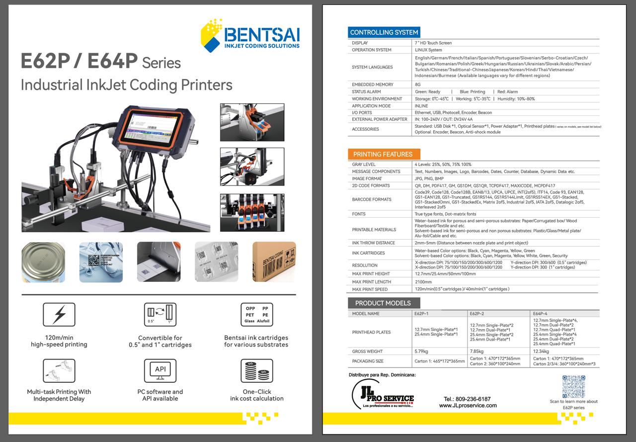 La serie Bentsai E62 se destaca por su flexibilidad y rendimiento superior en codificación industrial. Diseñada para satisfacer diversas necesidades de impresión, esta impresora ofrece opciones de cabezal simple o doble, permitiendo el uso de cartuchos de inyección de tinta de 0.5" o 1 pulgada.